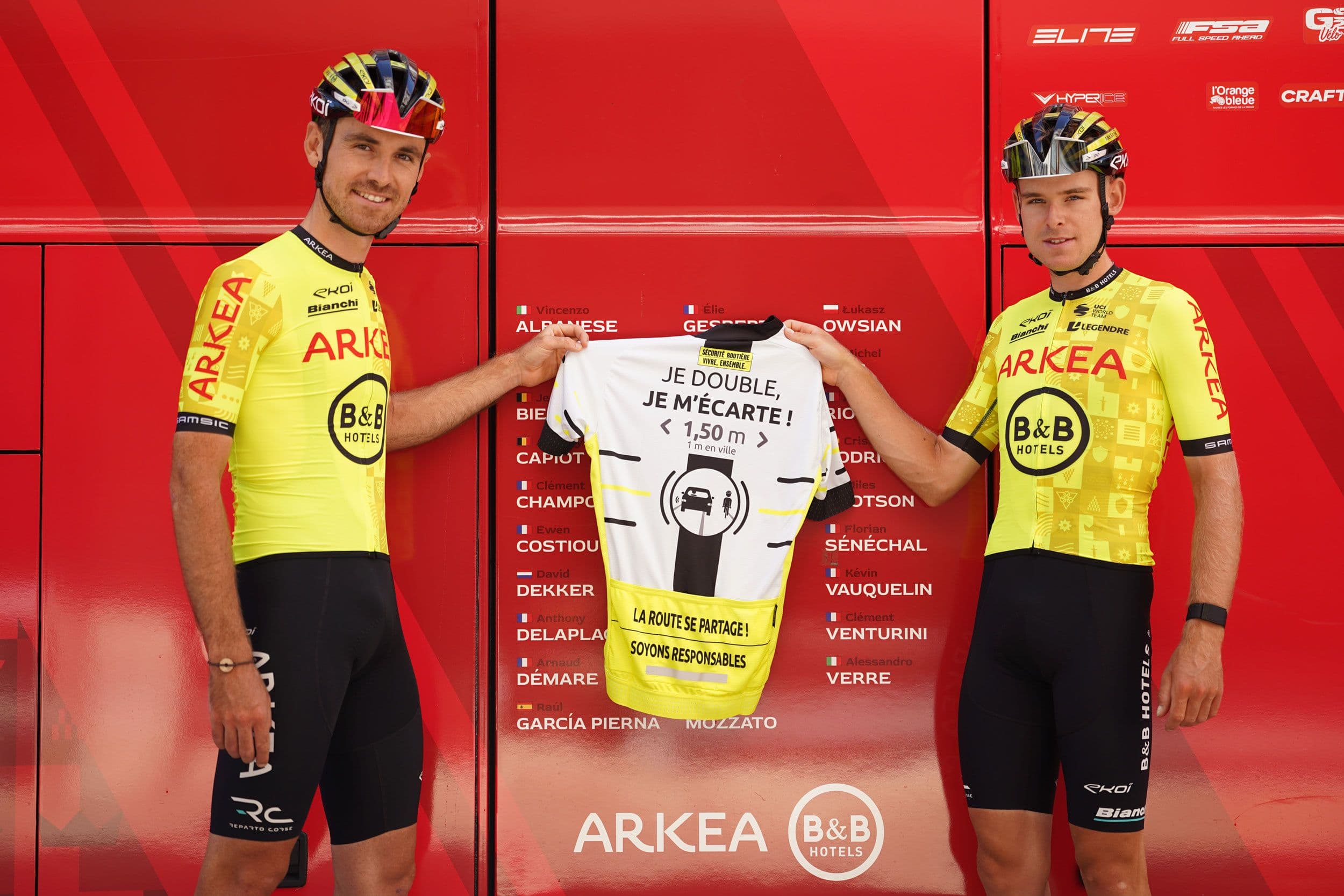 "Emmanuel Hubert, Manager Général des équipes ARKEA-B&B HOTELS, a choisi de pérenniser l'usage des maillots jaune fluo sur la Vuelta a España pour ses coureurs cette année encore. Je l'en remercie car cette couleur visible sur la route, porte très fort devant les médias du monde entier le message que prone la mission de "La Route se partage". Cette exposition de trois semaines sur la Vuelta en faveur de notre opération est forte, et nous permet, nous, "La Route se partage" de relayer le message que nous portons et qui est de favoriser la meilleure des cohabitations entre tous les usagers de la route avec encore plus de force en bénéficiant ainsi du soutien d'une équipe cycliste professionnelle évoluant au niveau UCI WorldTour."